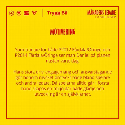 Varje månad under säsongen kommer vi att i samarbete med TryggBil utse "Månadens Ledare", ett sätt att uppmärksamma ett antal av alla våra fantastiska ledare som finns i föreningen. Vår huvudpartner TryggBil ordnar med pris till vinnaren!