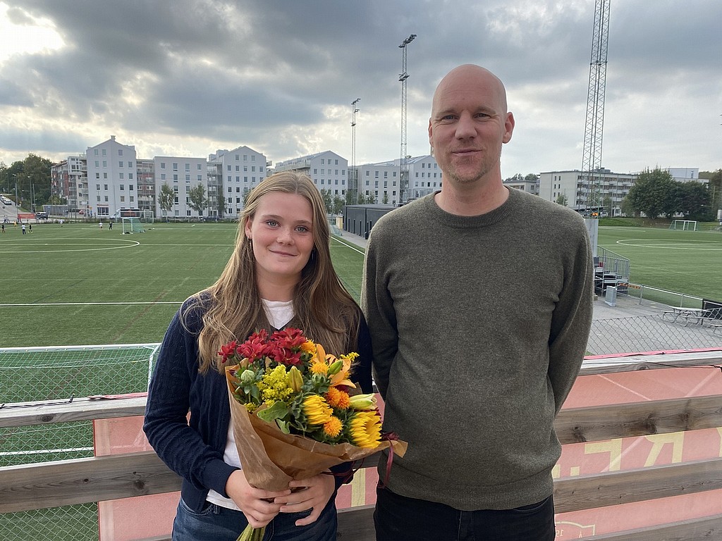 Ellie Junetoft och sportchef Jeppe Mauritzson vid dagens uppvaktning på Tyresövallen.