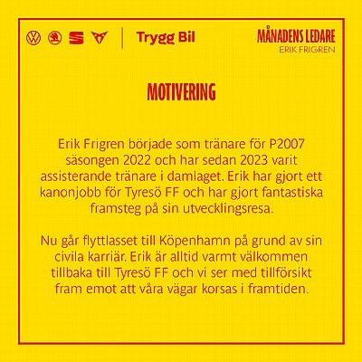 I vår förening är vi oerhört stolta och tacksamma för alla våra fantastiska ledare, som möjliggör en meningsfull fritid för våra barn och ungdomar i Tyresö. Mycket av deras enorma arbete sker i det tysta, dessa vill vi lyfta fram i samarbete med vår Huvudpartner Trygg Bil Stockholm AB .