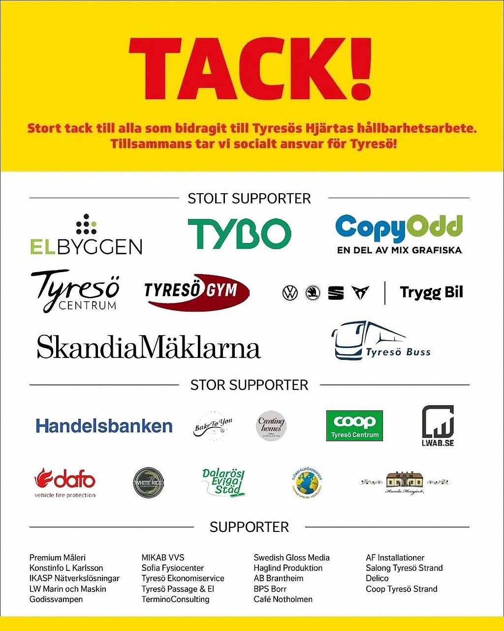 Utan våra fantastiska samarbetspartners skulle vårt arbete att vara Tyresös ledande samhällsaktör inte vara möjligt. Vi vill passa på och tacka alla lokala företagare som stöttar oss och vårt arbete att göra Tyresö till en liten bättre plats att leva på, både att skapa en meningsfull fritid för barn och unga och våra sociala projekt.