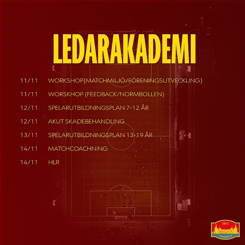 Den 11 november är det premiär för årets ledarakademi. Ledarakademin lanserades 2023, där all träningsverksamhet hos lagen stängs ner under en vecka och våra ledare får möjlighet till fortbildning och nätverkande med andra fotbollsledare, för att på så sätt ges bästa möjliga förutsättningar för att kunna bedriva en fotbollsutbildning på hög nivå.