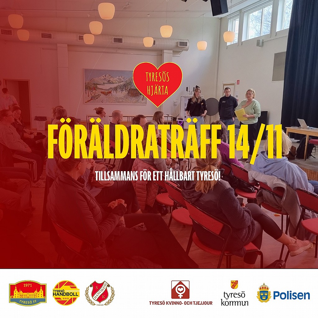 Tyresö FF bjuder genom hållbarhetsprojektet Tyresös Hjärta in till föräldraträff i samverkan med Tyresö Handboll, Hanvikens SK Fotboll, Tyresö Kvinno- och tjejjour, Tyresö Kommun och Polisen.