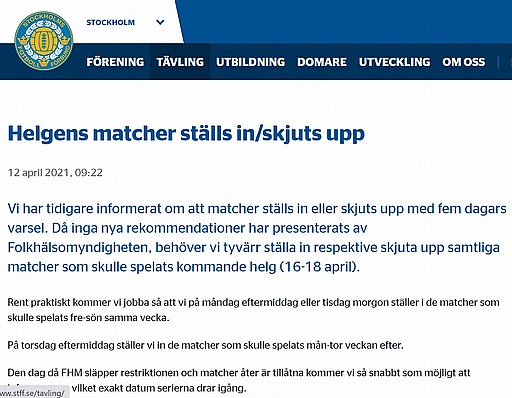 Vi har vant oss nu, men lika ledsamt är det ändå. StFF beslutade idag att ställa in/skjuta fram kommande helgs matcher då inga lättnader av de pågående restriktionerna kommunicerats från myndighetshåll.