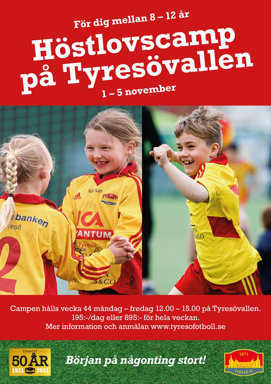 Vecka 44 är det höstlov och vi arrangerar som vanligt en Fotbollscamp för våra medlemmar. Är du 8-12 år och vill få möjlighet att träna på dina färdigheter tillsammans med andra spelare från framför allt Tyresö FF och med våra duktiga instruktörer som du kanske träffat på Träna mera så anmäl dig redan idag för att vara säker på att få plats.