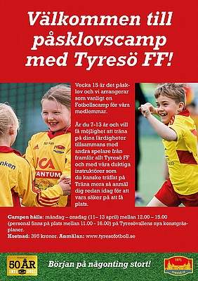 Vecka 15 är det påsklov och vi arrangerar som vanligt en Fotbollscamp för våra medlemmar. Är du 7-13 år och vill få möjlighet att träna på dina färdigheter tillsammans med andra spelare från framför allt Tyresö FF och med våra duktiga instruktörer som du kanske träffat på Träna mera så anmäl dig redan idag för att vara säker på att få plats.