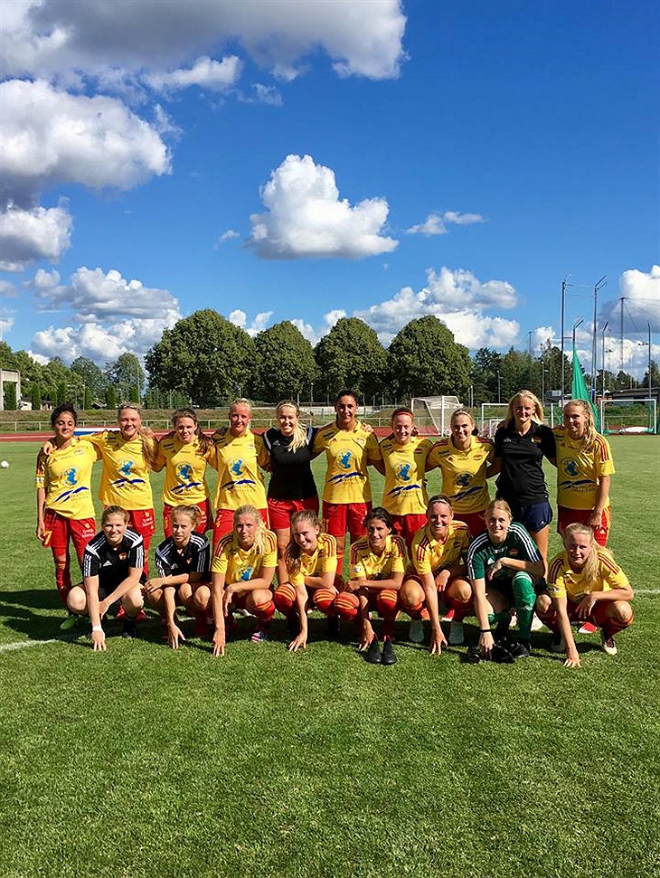 Vi startar matchen bra och får omgående press på hemmalaget. I den 4:e minuten får vi en frispark på högerkanten. Frida Thilén lägger in en fin boll i straffområdet som Maria Poli möter upp med pannan och vi har 0-1 perfek vid stolproten. Minuten senare kommer Frida Thörnqvist loss på vänsterkanten, snyggt inspel till Therése Boström men skottet går utanför. Hemmalaget spelar ganska rakt men är ganska farliga i sina kontringar och de har några riktigt snabba spelare. I den 8:e minuten får vi se några felpass från oss som gör att de kommer till en sådan kontring. Men Linn Österholm jobbar bra hemåt och lyckas få till en inspark till oss.