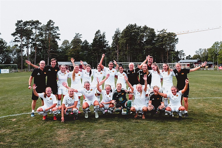 Nu känns det som vi kontrollerar matchen. Hemmalaget försöker att komma närmare men vi är ruggigt effektiva. I den 66 minuten får vi se ännu ett snyggt mål. Victoria Isaksson rullar ut bollen till Josefine Lindberg som direkt slår in bollen till Maria Poli i straffområdet. Hon får ohotad nickskarva in bollen i bortre burgaveln till 0-3. Några minuter senare stänger Frida Thörnqvist matchen när hon efter pass från Lina Malmborg sen rundar målvakten och placerar in 0-4.