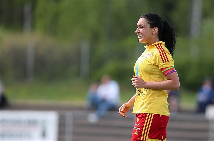 33:e minuten nu och Josefine Lindberg tunnlar Örebrobacken på högerkanten. I nästa situation blir hon tyvärr skadad och tvingas utgå. Hon ersätts istället av Emelie Nygren som efter 2 korsbandsoprerationer och otaliga rehabtimmar äntligen får göra come back efter 3 år.