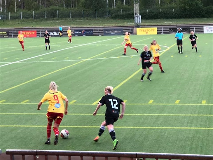 Tyresö vill ha mer och fortsätter att trycka på. Vi ser i den 39:e minuten ett snyggt anfall från Moa Nilson Barkenheim som passar upp till Sofie Thörnqvist som direktpassar ut till Emelie Nygren som i sin tur direktpassar till Frida Thörnqvist. Frida tar sig snyggt in i den högra delen av straffområdet och avlossar ett skott som målvakten räddar. 43:e minuten och Frida Thörnqvist igen på den högra sidan av straffområdet. Där blir hon fälld av målvakten när hon ska runda henne och domaren visar gult kort och pekar på straffpunkten. Maria Poli sätter hårt och behärskat den till 2-0. Vi går mot pausvila men i de sista sekunderna av halvleken så utökar Maria Poli till 3-0, en målvaktsretur på skott av Frida Thörnqvist. Paus.