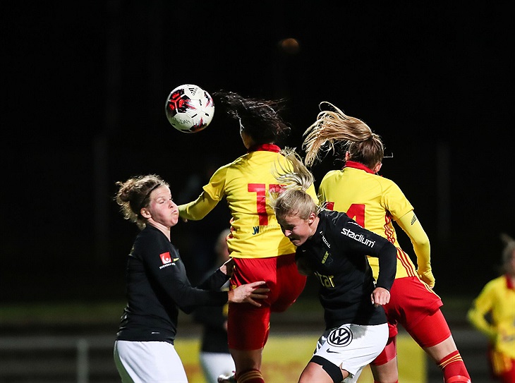 Mera AIK nu. De rullar runt bollen bra men Tyresöförsvaret över hela banan är kompakt och bra. I den 32:a minuten bra anfall Tyresö. Lina Malmborg skarvar vidare en boll upp till Sofie Thörnqvist. Hon spelar in till Frida Thörnqvist som återigen får till ett bra skott men även den här gången räddar AIK´s målvakt till hörna från vänster. Bra slagen av Ida Ahlbom och där sätter Sofie Thörnqvist pannan till och snyggt nickar in 2-1 till Tyresö. Några minuter senare nästan friläge för AIK när de slår en djupledsboll mellan Tyresöbackar. Jempa Bakai bra med och rensar undan i sista sekund. Efter det är det Tyresö som har lite mer boll ett tag och kommer till flera fina anfall mot AIK målet. 3 minuter kvar av havleken och AIK kommer på högerkanten. Inspel snett inåt bakåt och bra skott men även en fantastisk räddning av Jempa Bakai som tippar bollen till Ida Bengtsson som inte riktigt får bort bollen utan det blir ytterligare ett inspel från AIK spelare och nytt skott men även det tar Jempa Bakai hand om. Tyresö går till halvtidsvila med en 2-1 ledning och visar storpubliken 489st att de kommer sälja sig dyrt idag.