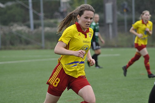 Ella Bergström ger sig ut på en räd på vänsterkanten i den 41:a minuten och fixar en hörna från vänster. Hörnan går till Alva Lodén som trycker iväg ett skott.....över.
